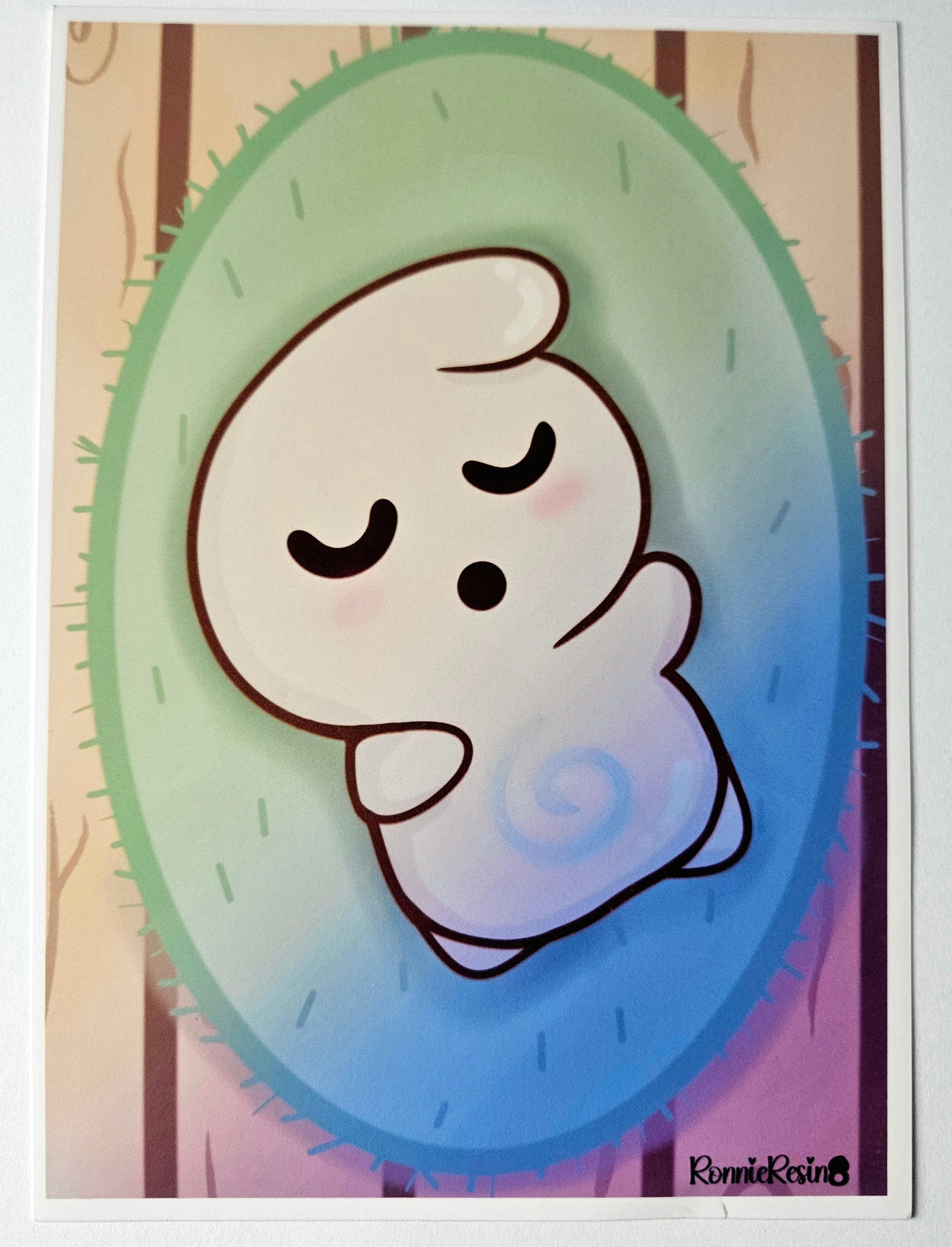 Cute hand drawn, cozy art print of Rez taking a nap!